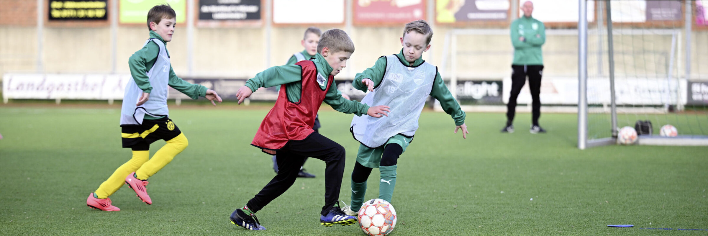 - Spielblock 2 (30 Minuten): erneut 1-gegen-1- bis 4-gegen-4-Varianten auf mehreren Feldern auf Tore