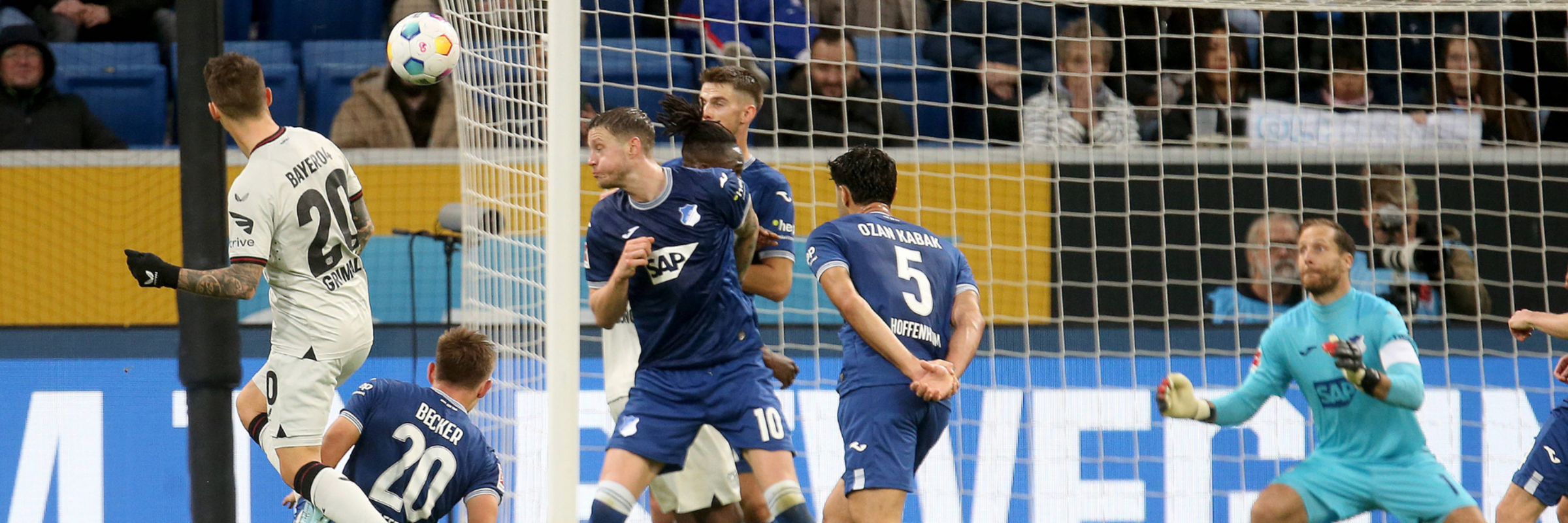 Die TSG 1899 Hoffenheim verteidigt im 16er raum- und um den Elfmeterpunkt herum mannorientiert. Grimaldo steht außerhalb des Strafraums ohne direkten Gegenspieler.