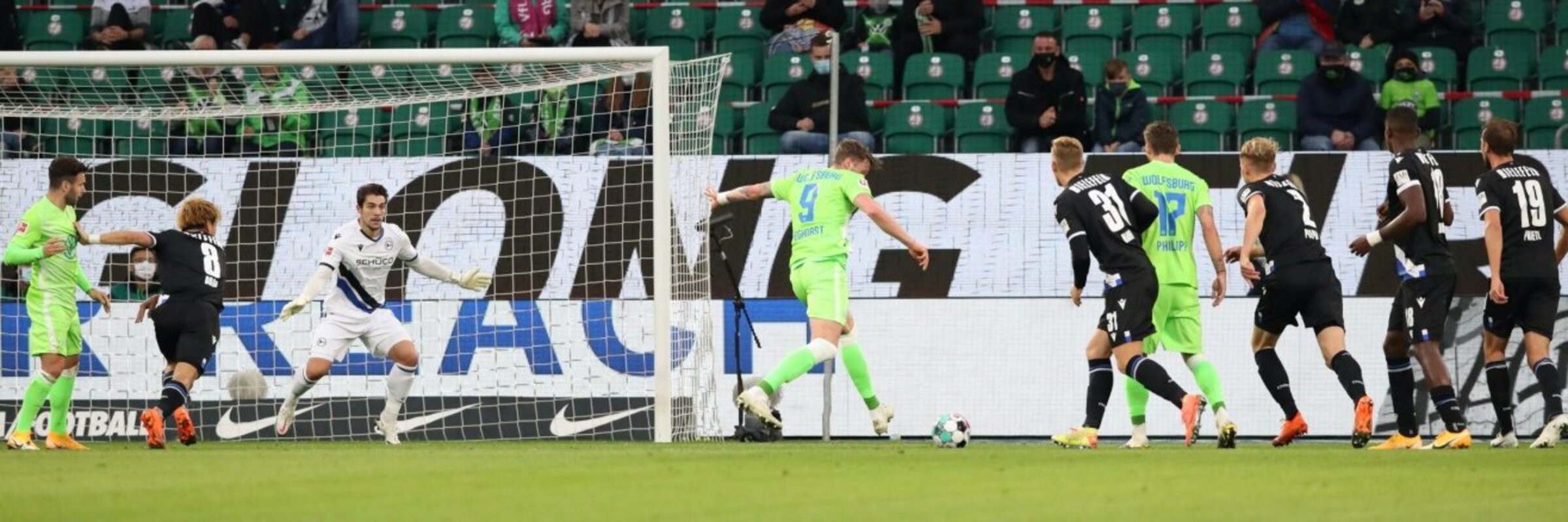 Dienst nach Vorschrift: Durch clevere Interpretation der neuen Abstandsregel bei Freistößen, trifft mit Wout Weghorst einer der gefürchtetsten Strafraumstürmer der vergangenen Bundesliga-Jahre.